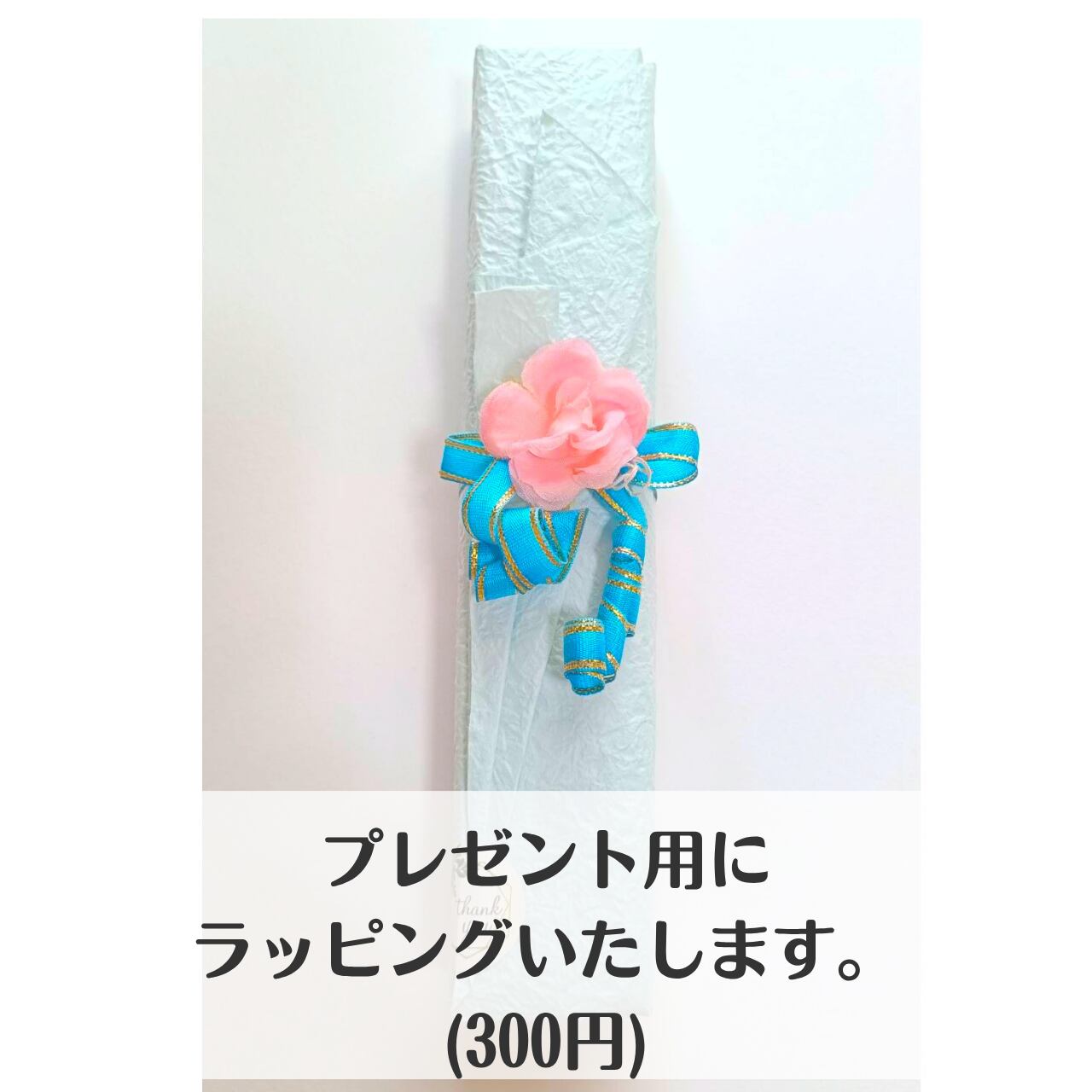 エンボス加工の包装紙とお花で有料のプレゼント包装を承ります。(300円)