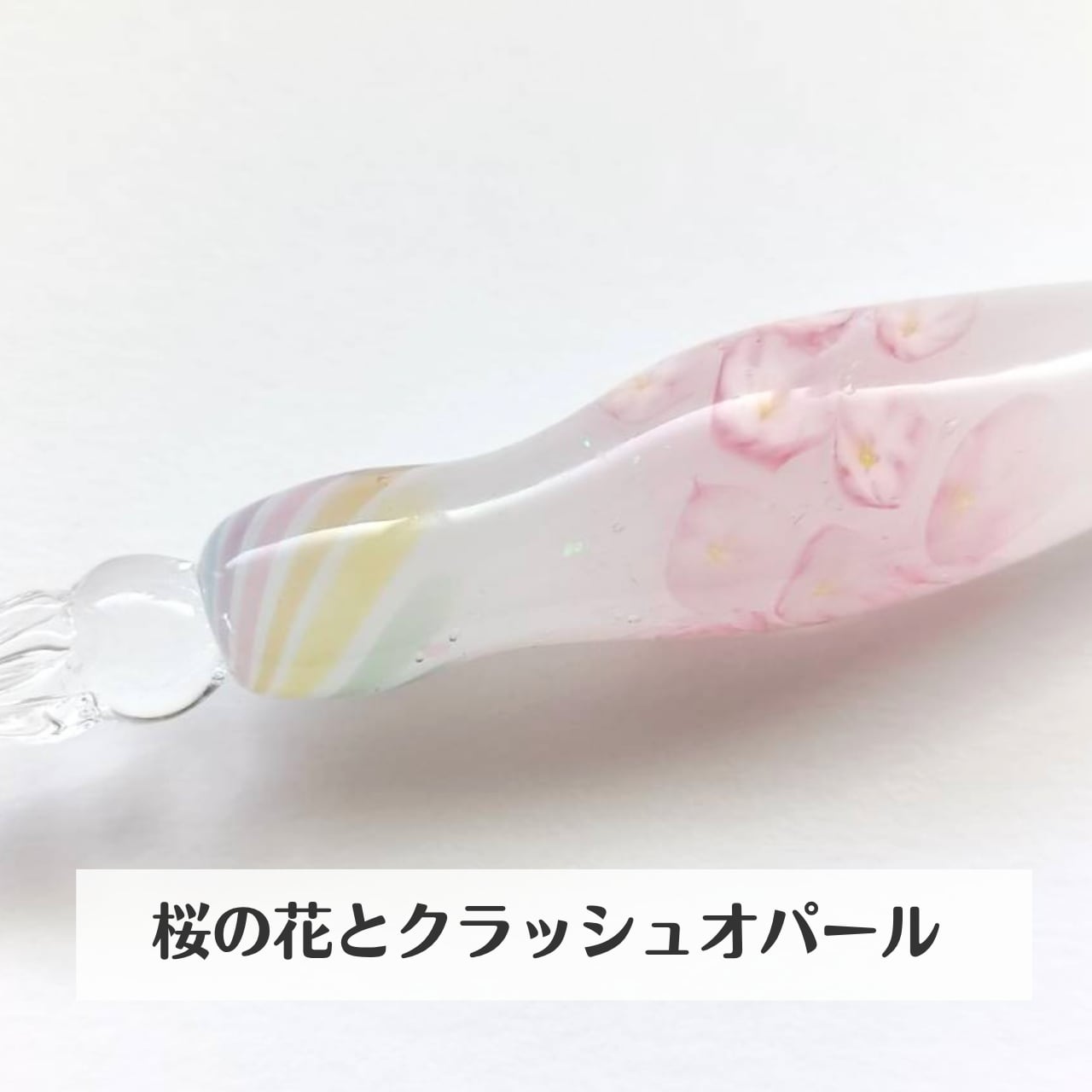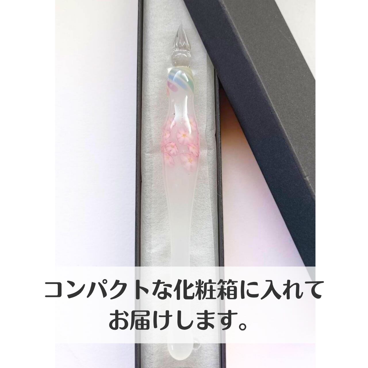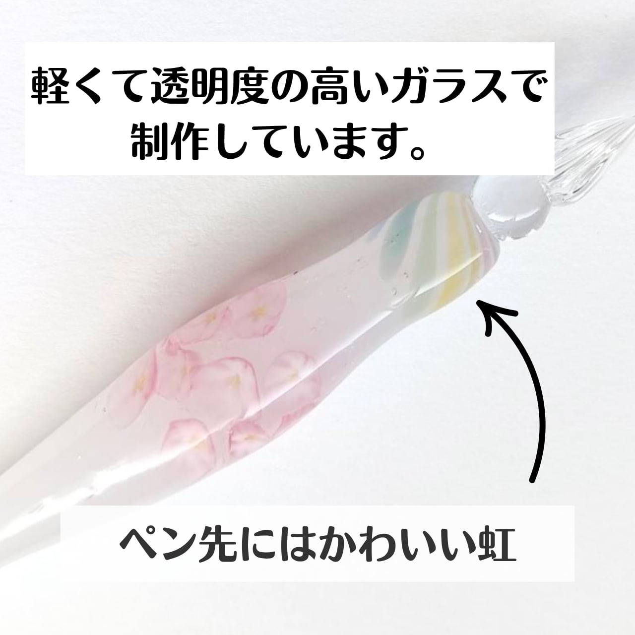 小さめの桜の花を透明のガラスの中に埋め込んで、ペン先近くに淡い「虹」も配しました。
